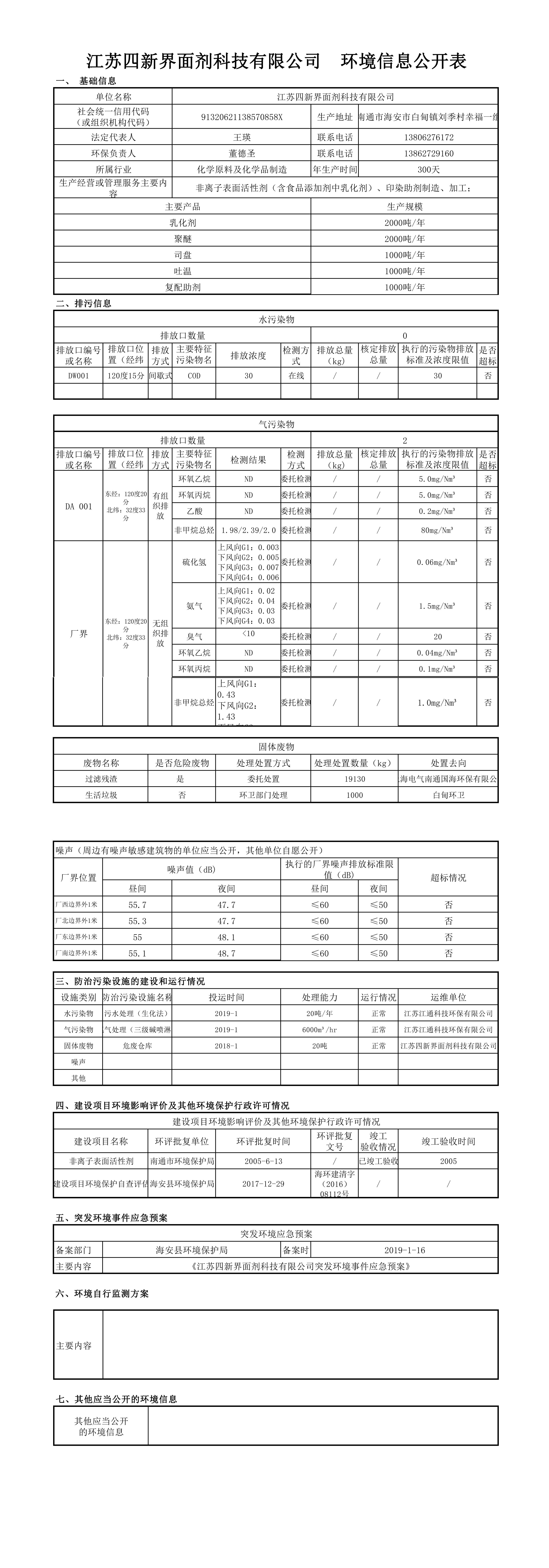 江蘇四新界面劑科技有限公司 環(huán)境信息公開表2019年5月